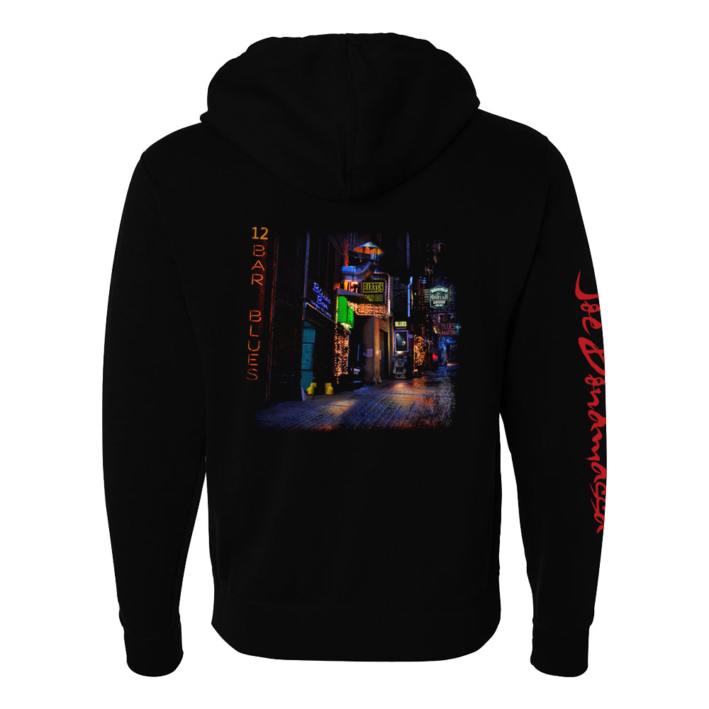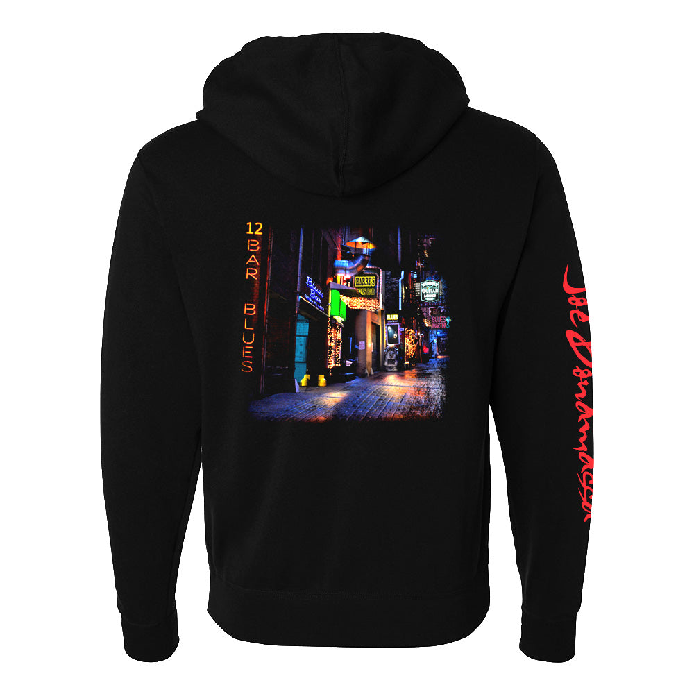 One of our most popular t-shirts is now available in a zip-up hoodie version! The 12-Bar Blues Strip has become the hottest destination in Blues City. Each night, the bars are packed from wall to wall with blues fans demanding scorching riffs, killer harmonica, and blues singing that pierces the soul. And the best part is – we’re open all night long! So grab a drink and come listen to your favorites by Joe Bonamassa and all of his friends in the blues. Then get some sleep in the morning because tomorrow night we’re doing it all again. That’s the blues-rock way.