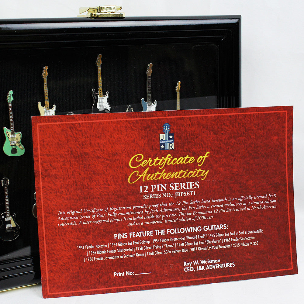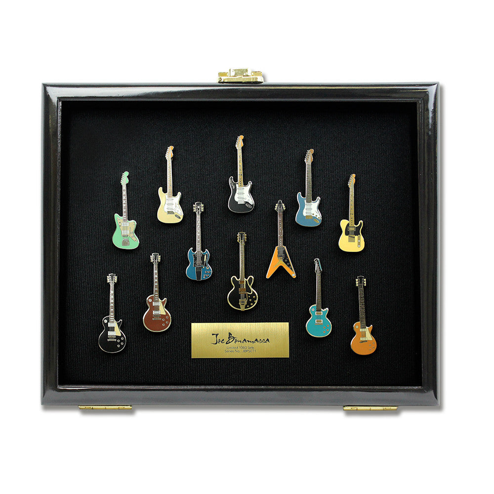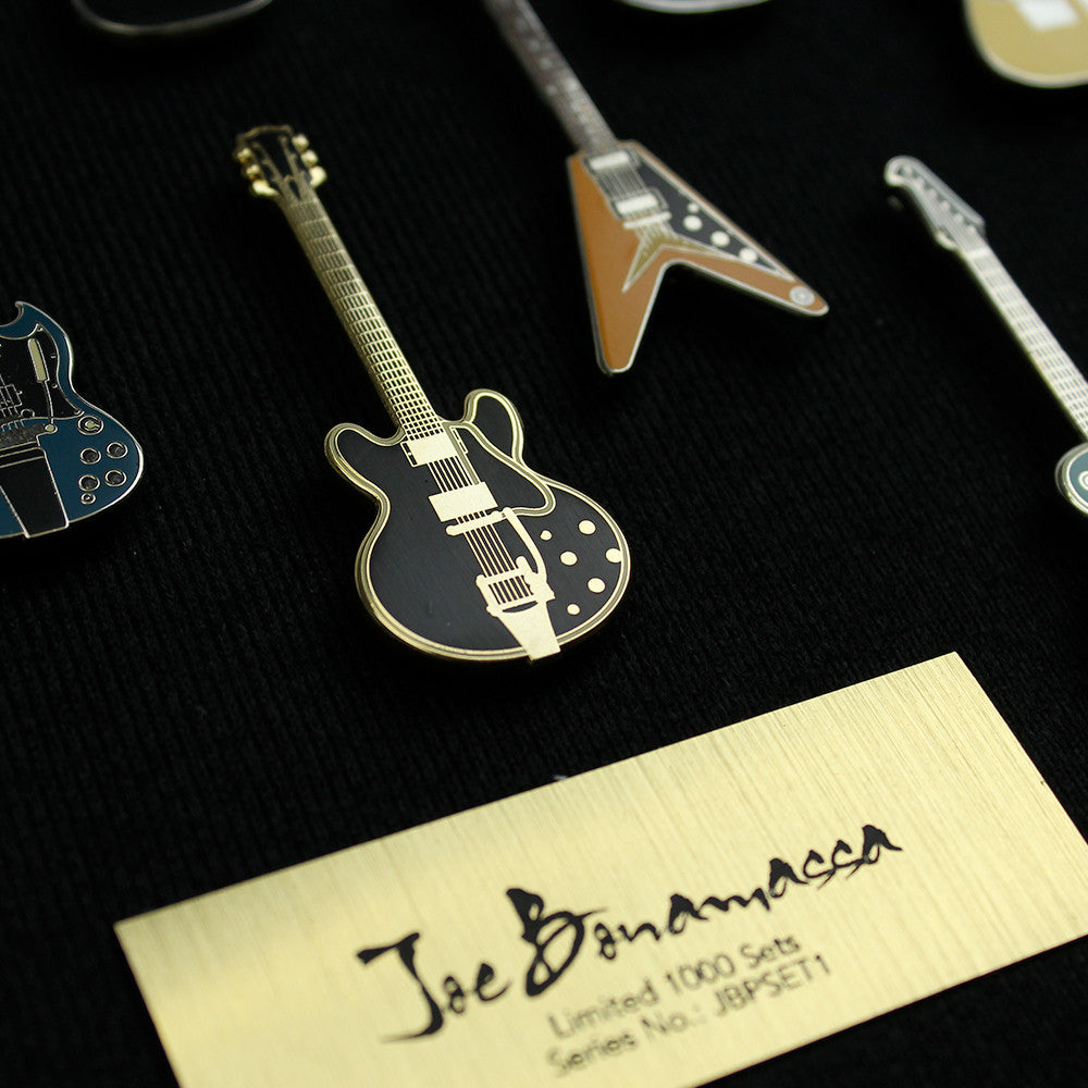 The Joe Bonamassa Guitar Pin Collection: Series One includes 12 guitar pins modeled on some of Joe's best guitars, including his 1954 Gibson Les Paul Goldtop. This official JB Collector’s item is a pin series for the ultimate guitar pin lover. Pins include some of Joe’s best Fenders and Gibsons.