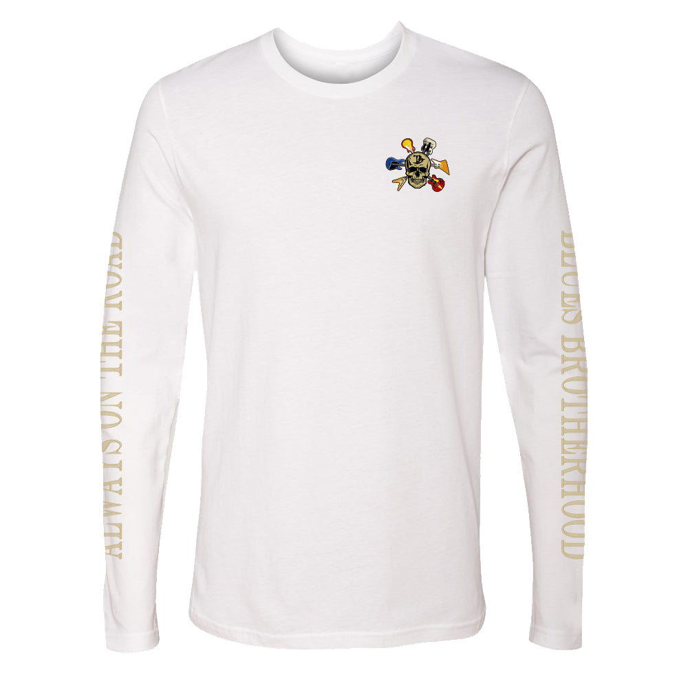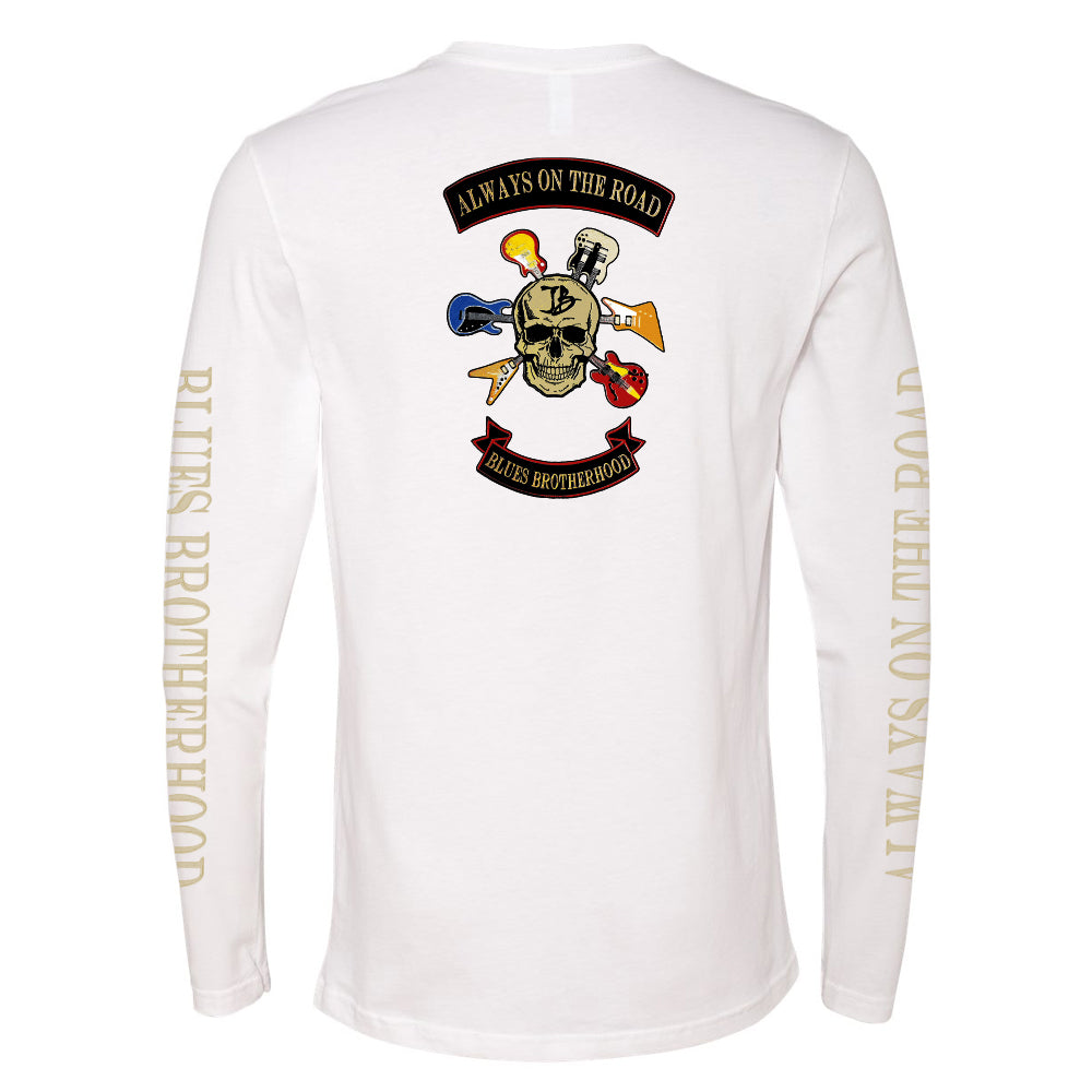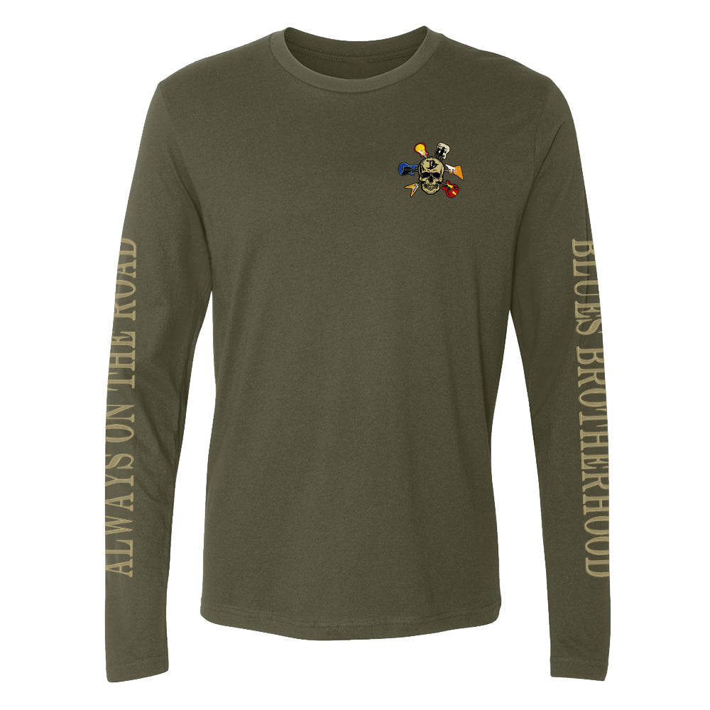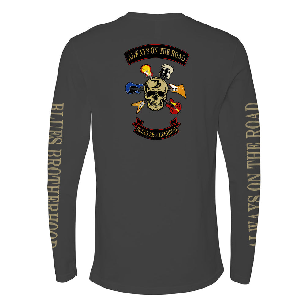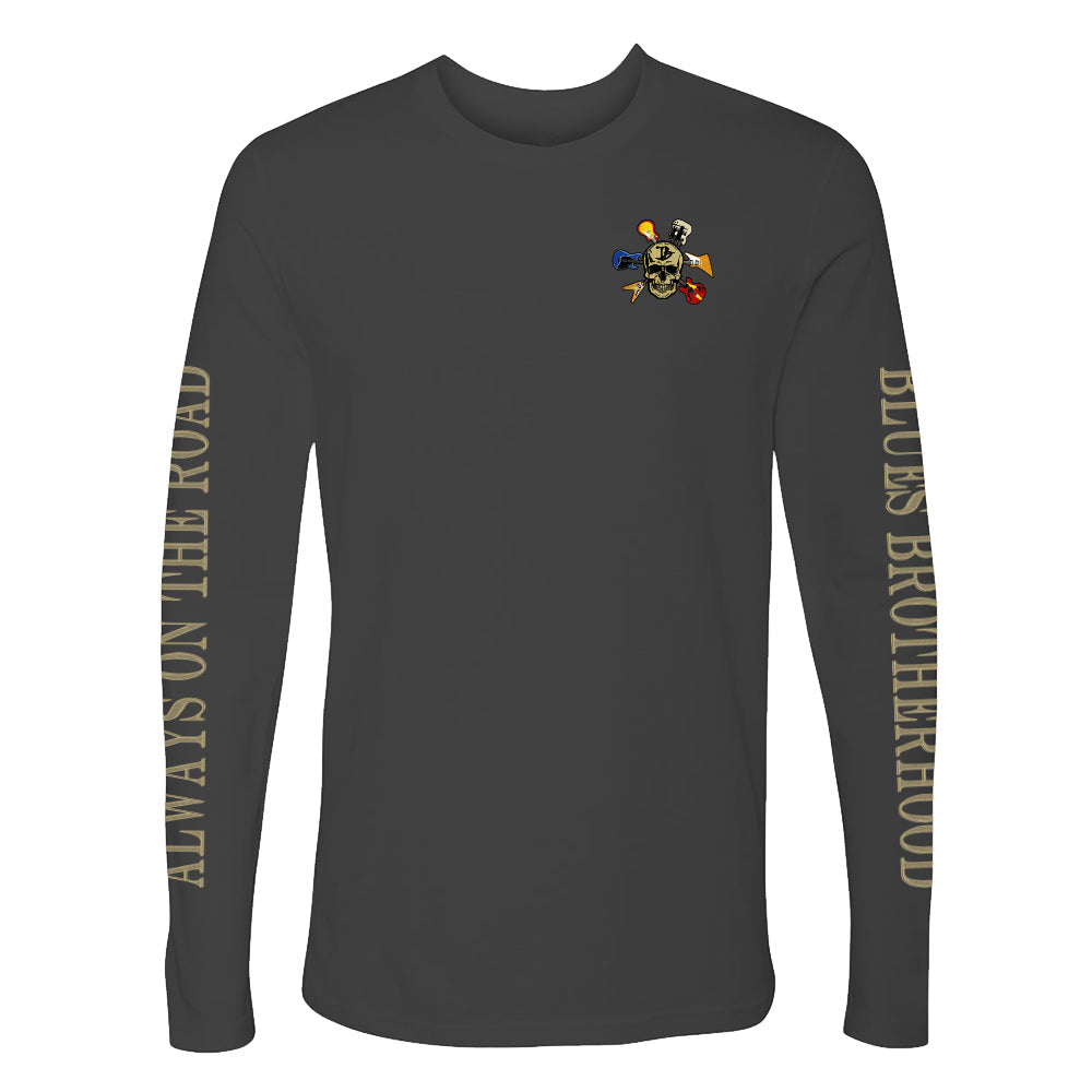 The Blues Brotherhood Long Sleeve t-Shirt features the Joe Bonamassa Blues Brotherhood design with a skull and 6 electric guitars on a black t-shirt.