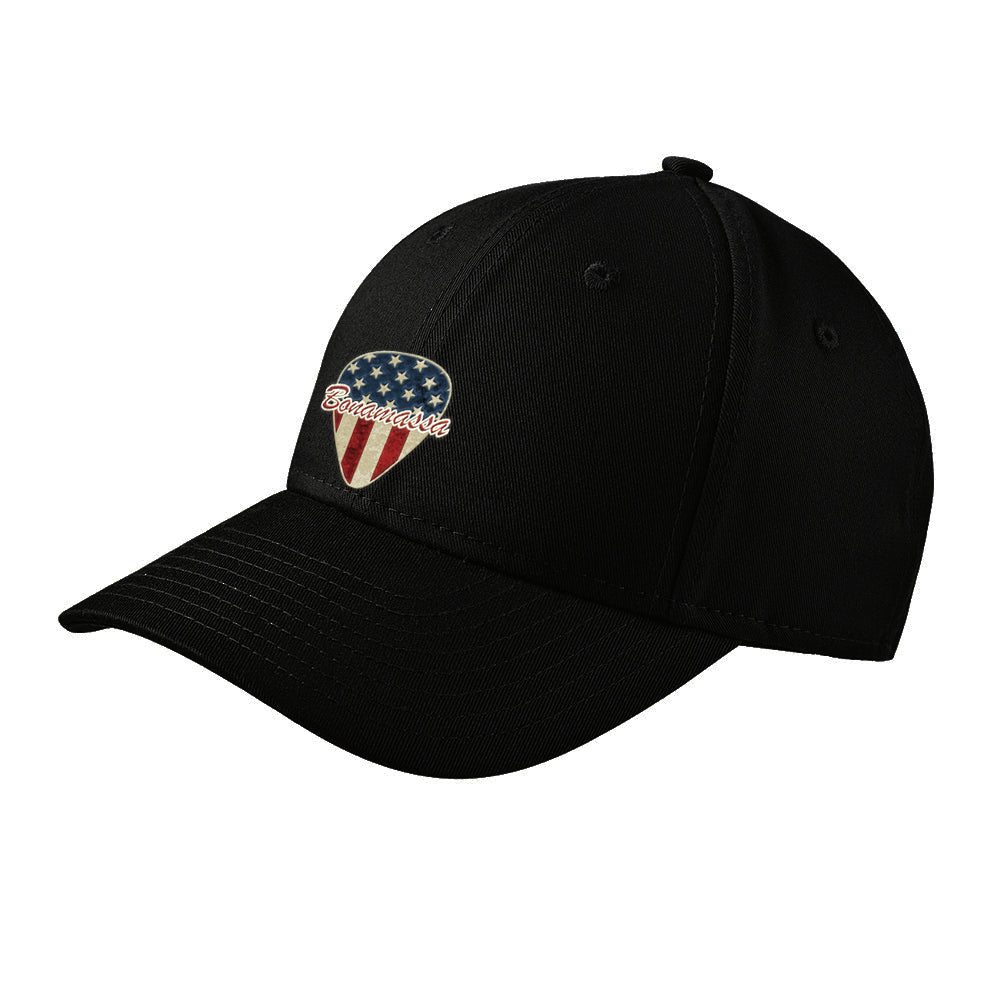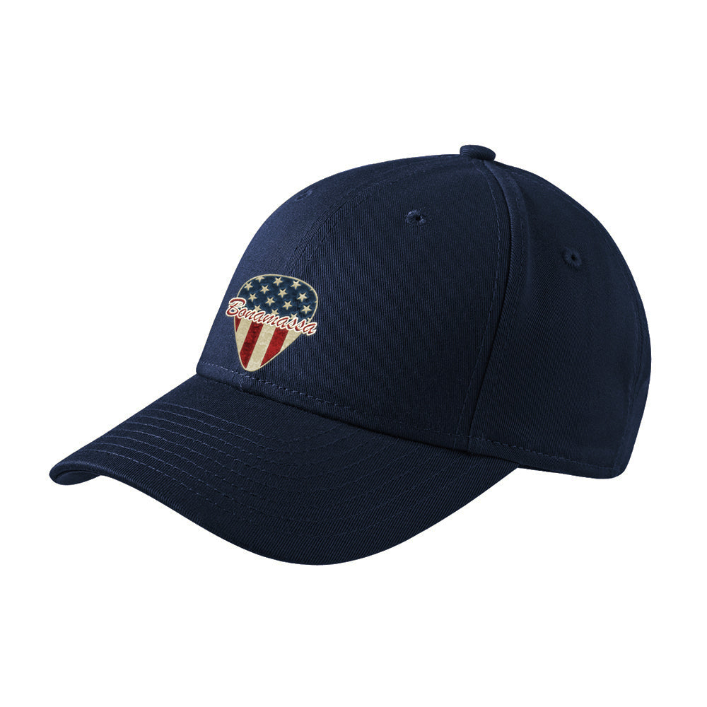 The Joe Bonamassa American Style New Era Hat in Black features a Joe Bonamassa guitar pick with an American flag design and says "Bonamassa".