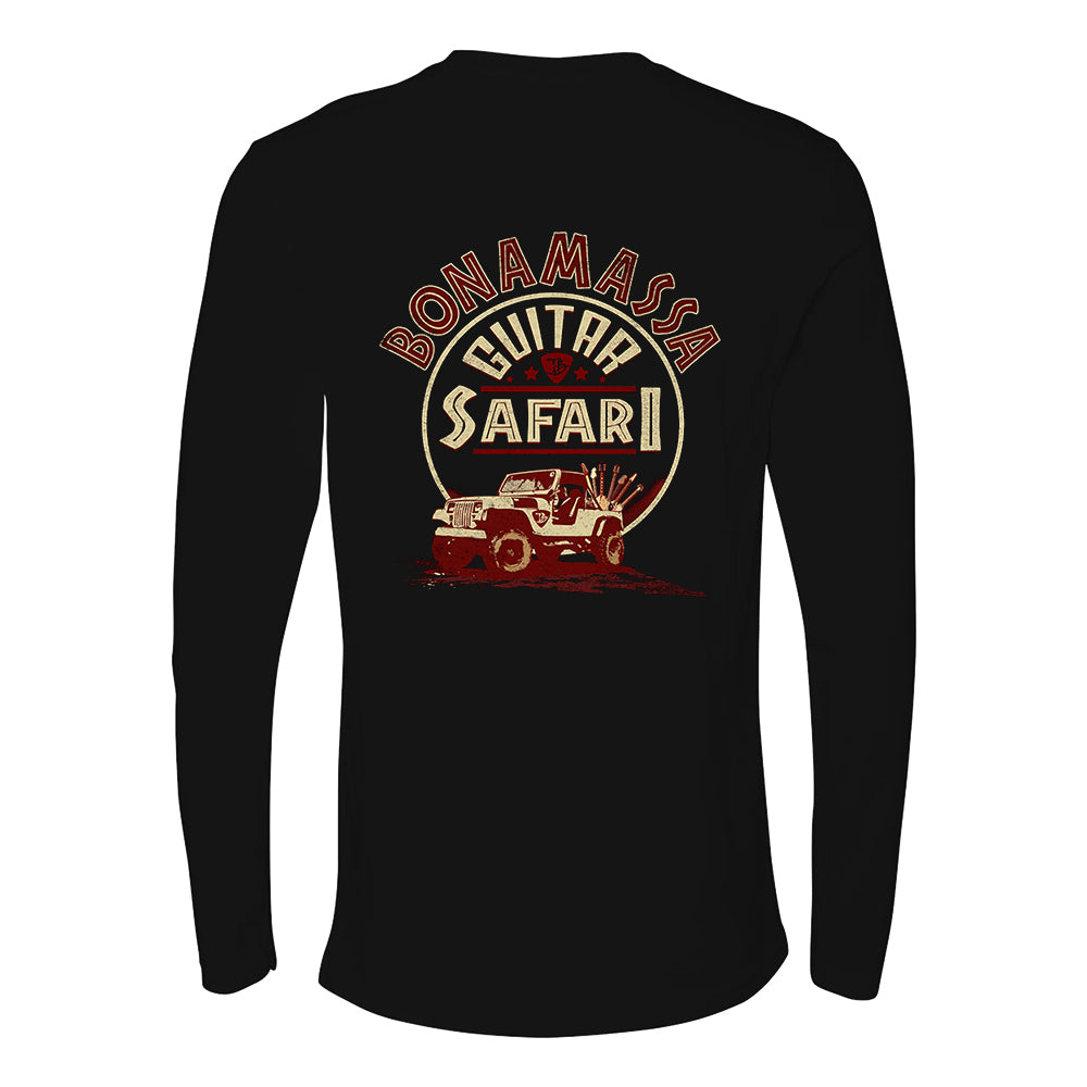 Need a little tiger in your tank? Feeling like jamming out in the jungle? Then this funky new "Bonamassa Guitar Safari Long Sleeve T-shirt " is for you! This shirt features "Bonamassa" written with a dark red design and a safari vehicle packed with guitars set against a black backdrop. Inspired by Joe Bonamassa's new monthly column in Guitar Player magazine, this great shirt shows how dedicated you are to exploring and hunting all things guitar. What will YOU see on your guitar safari?