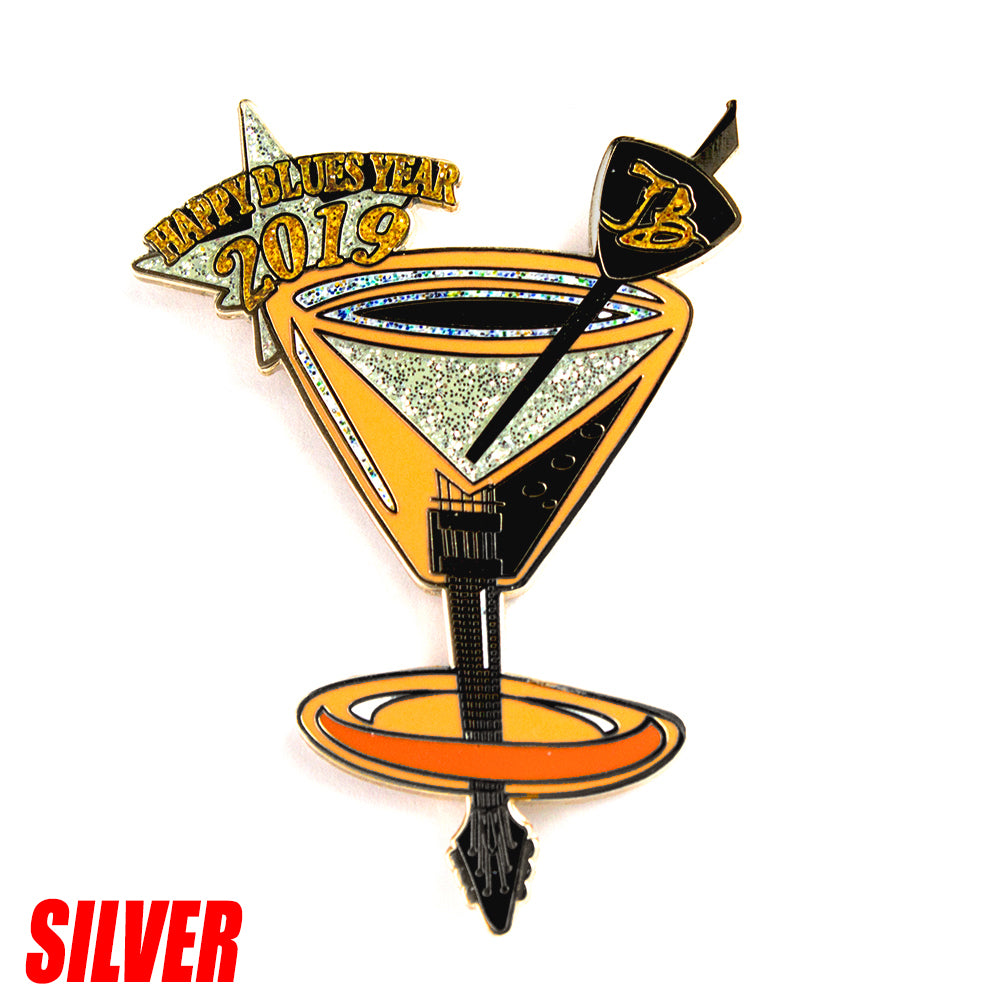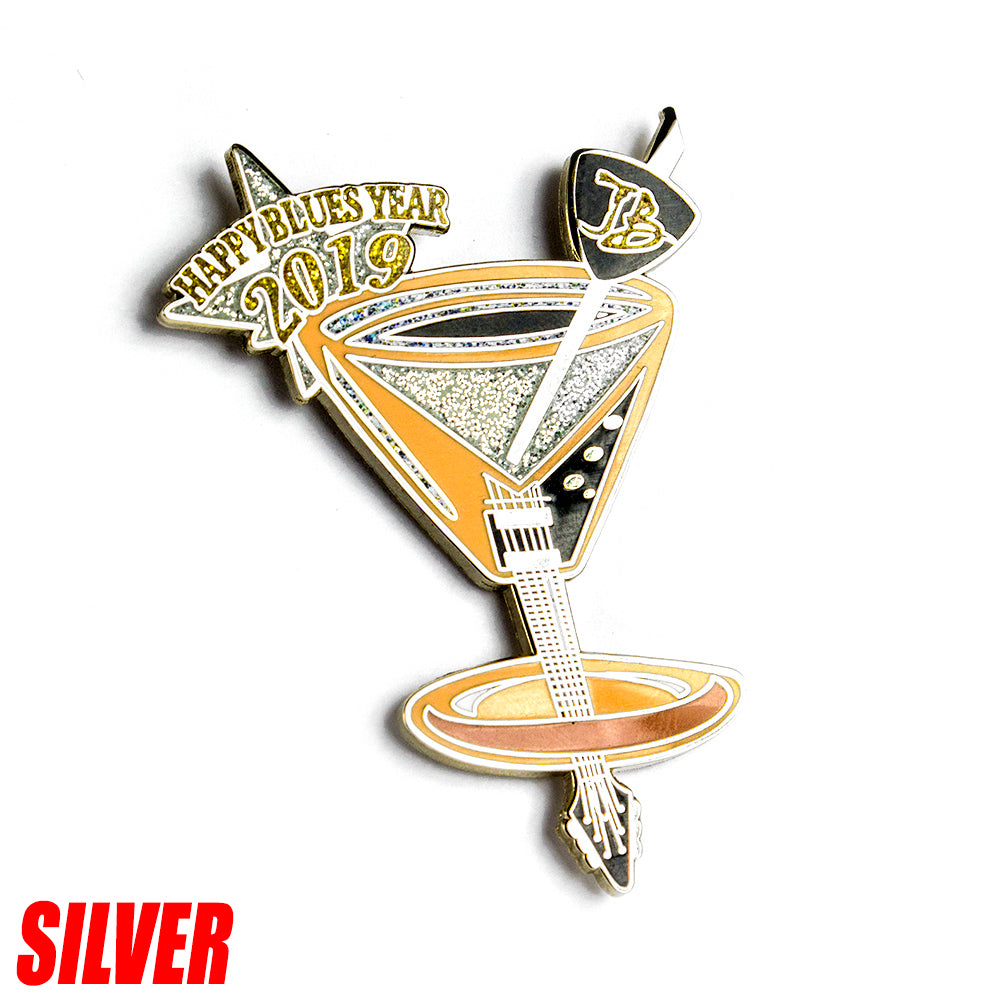 The 2019 Blues New Year pins are finally here! Ring in the new year with this eclectic 2019 pin! It's a snazzy Flying V designed as a martini glass with a JB pick swizzle stick! It has an orange and silver color enamel to make it stand out at any party. Get your's before they're gone!