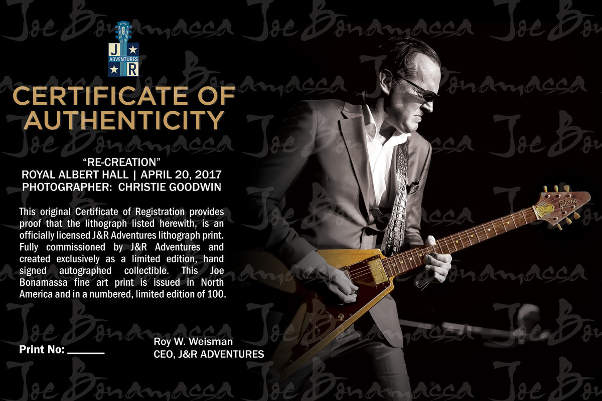 This is a limited run of ONLY 100 prints. Each lithograph is personally hand-signed by Joe Bonamassa and comes with a certificate of authenticity ensuring the quality and collectible nature of each piece. Each of the 100 owners of the official " Re-Creation " lithograph will receive 2 tickets + meet & greet passes to the show of their choice.