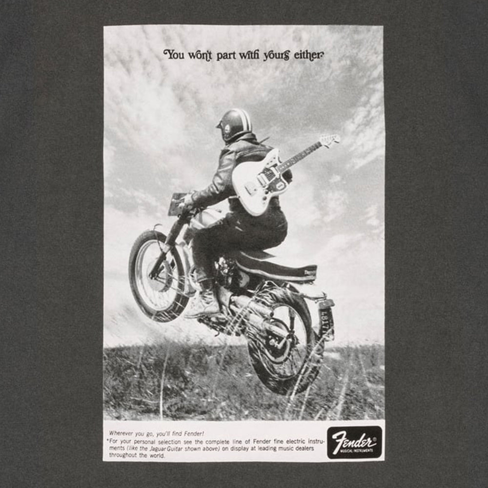 Launched in 1960 Fender's, "You won't part with yours either" campaign was aimed at guitar players who cherish their Fender guitars, and the deep emotional connection that musicians often develop with their instruments. Be a part of our history while wearing your vintage black t-shirt with motorcycle rider graphic from this iconic vintage ad. Now you are ready to Hit the Open Road!!