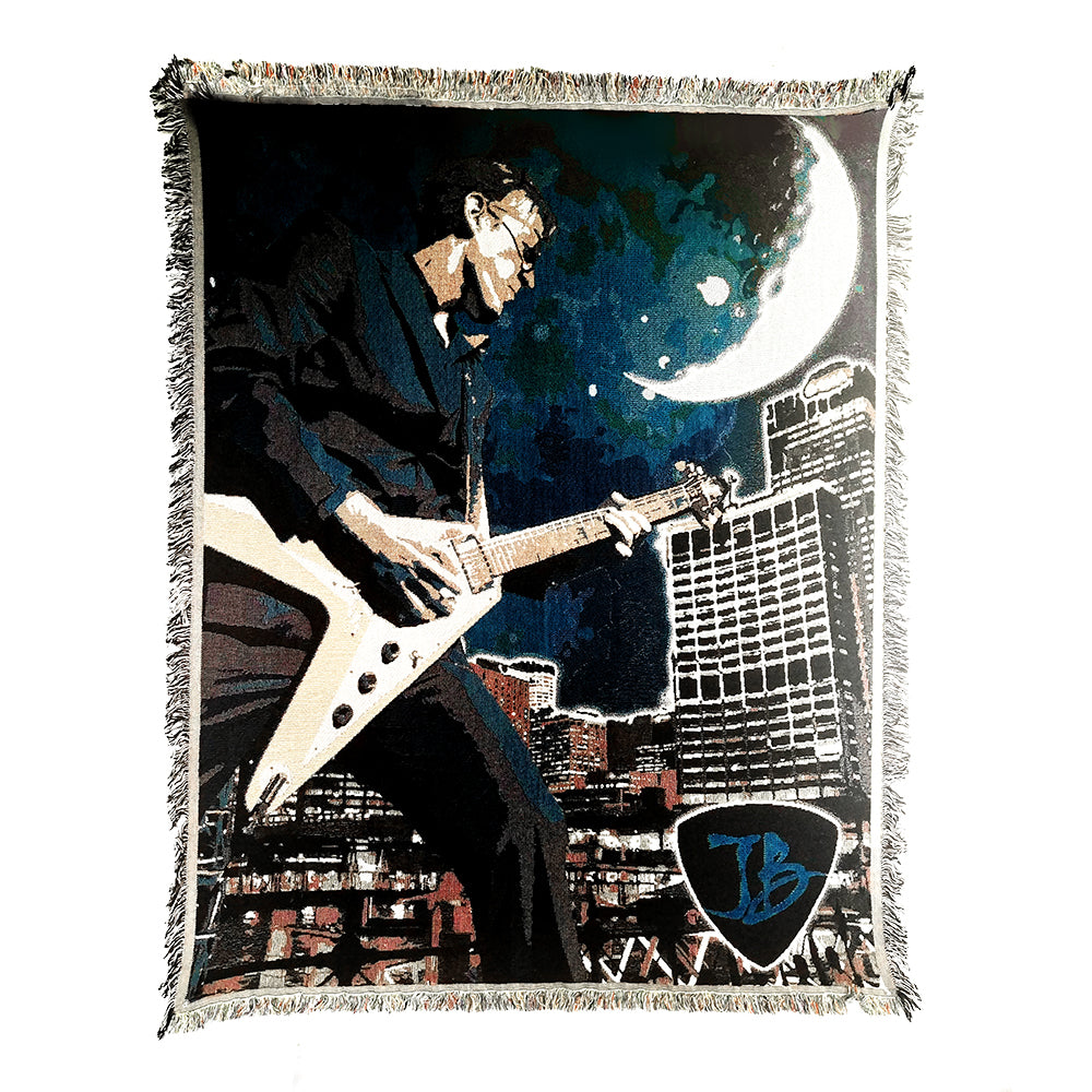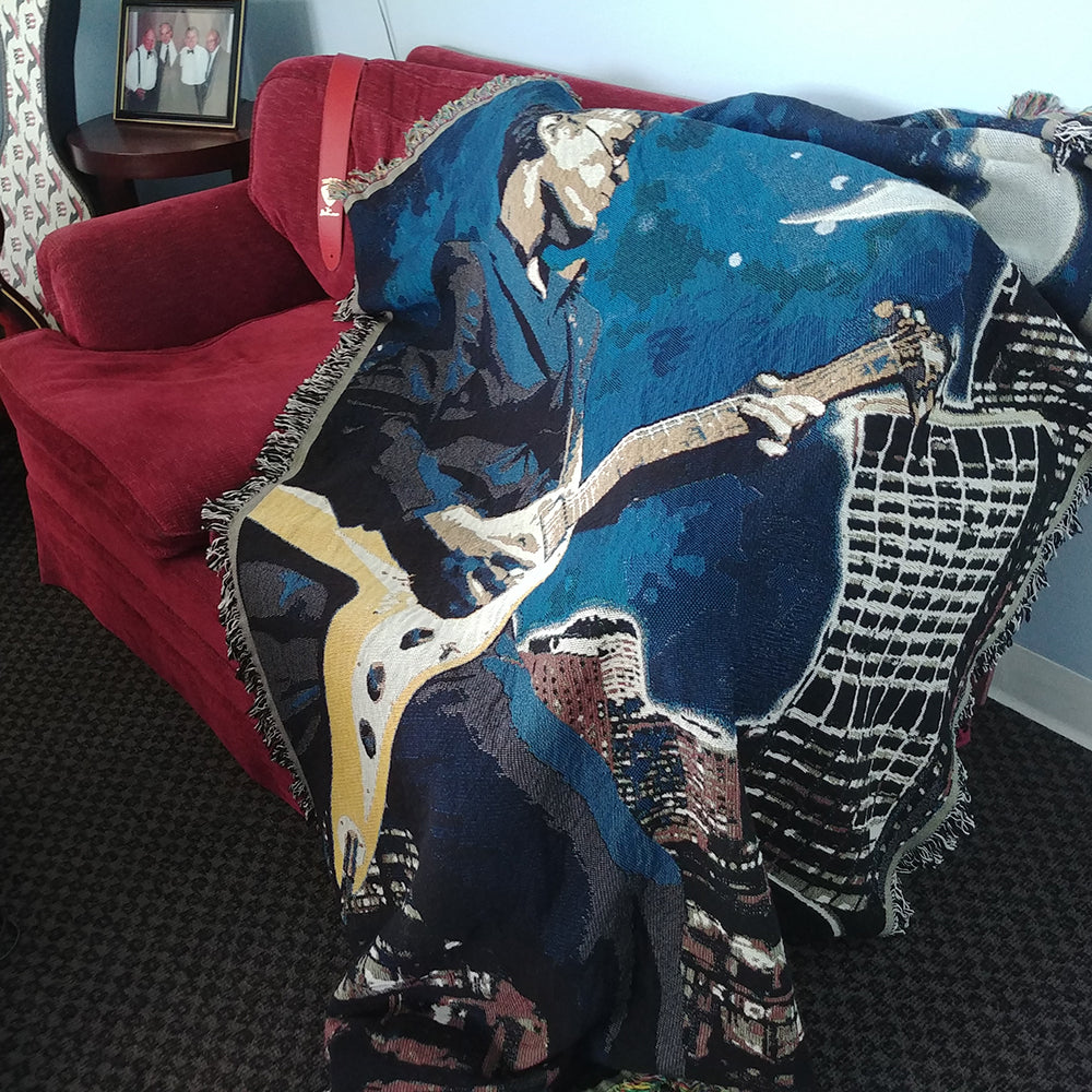 Snuggle up with your favorite blues guitar titan and share the "Blues Skyline blanket" as your backdrop for your man cave, a tapestry for your wall, music room, a throw for your couch or at a soiree on the beach. With the cool blue tones on this blanket, we reccomend a blue sky martini to add a touch of ambience to the party!