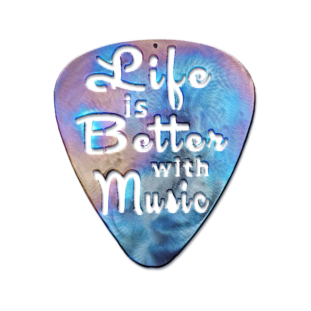 Guitar pick wall art is made from recycled 16-gauge steel and cut with a plasma cutter. Then it is polished and colored with a 6000 degree torch. The final step is clear powder coating which preserves the finish and prevents tarnishing and rusting, which allows you to hang it anywhere - outside or inside!