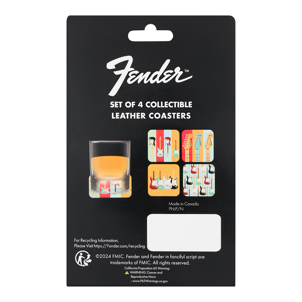 Add a touch of rock 'n' roll flair to your home or studio with the Fender® Stratocaster™ Modern Design Coaster Set. Inspired by the iconic curves and sleek style of the legendary Stratocaster® guitar, this set of four coasters is perfect for music lovers and Fender fans alike. Each coaster features a minimalist, modern design that blends seamlessly with any décor, while offering reliable protection for your surfaces. Made from 100% leather, these coasters keep your drinks steady and your vibe cool.