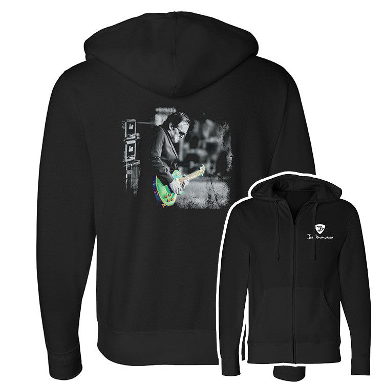 Get lucky by owning this new Joe Bonamassa "Lucky Blues" Zip-Up hoodie. This hoodie features the Joe Bonamassa guitar pick insignia on the front and features the Joe Bonamassa playing a beautiful emerald green Gibson guitar on the back. Show off your love of Joe and your stylish fashion sense all at the same time, and luck will always be on your side
