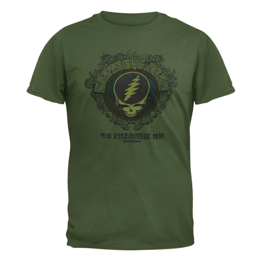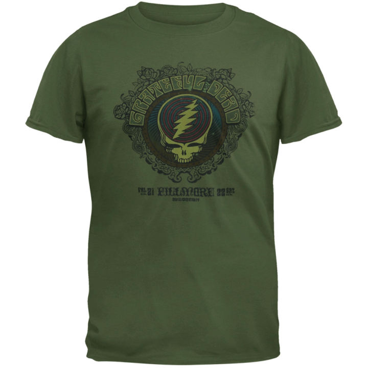 Grateful Dead sparked a musical revolution and allowed bands to speak freely and jam! Their music remains influential and iconic to this day. Add another great piece of Dead memorabilia to your collection with this shirt that celebrates one of the band’s great live shows at the Fillmore. The shirt features the iconic “lighting skull” logo on a navy green background.