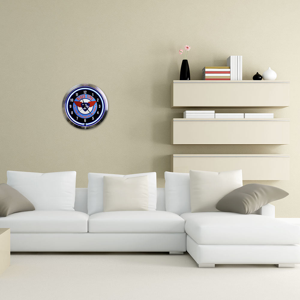 Never run late for band practice again with the JB vintage blues wall clock. This authentic collectible features a well-crafted chrome plating with a vibrant blue neon light Illuminating Joe's classic winged pick logo. This clock makes the perfect addition to any home, office, or man cave. Remember, it's never too late for the blues.