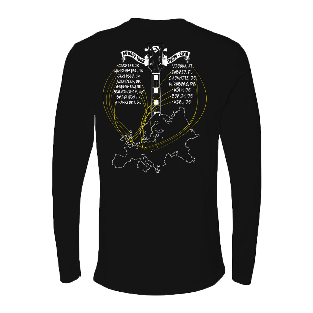 Joe Bonamassa has pushed through exhaustion, broken strings, and lack of Diet Coke to deliver his brand of blues-rock to his fans. He stays true to his slogan of being “Always on the Road” by embarking on an extensive trip to Europe. Represent the international bluesman with the official 2018 Spring European Tour long sleeve, featuring Joe’s favorite Flying V!