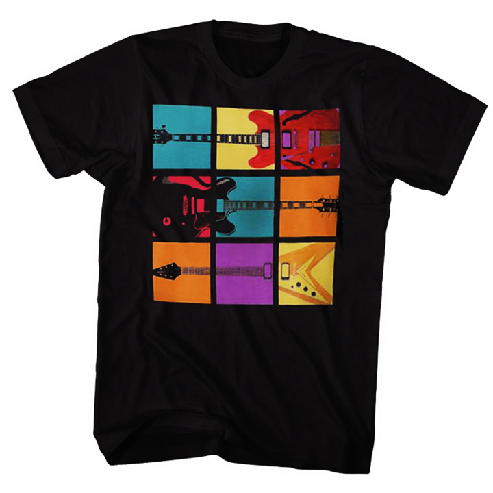 Three kings of the blues means three guitars. This new black crew neck t-shirt honors the guitars of the great blues men in a funky, Andy Warhol pop-art style. Decked out with eye-popping colors, the artistic design of this tee captures the spirit of the adventurous, path-forging blues greats that played these legendary guitars. Pay tribute to the kings and the guitars that made them icons.