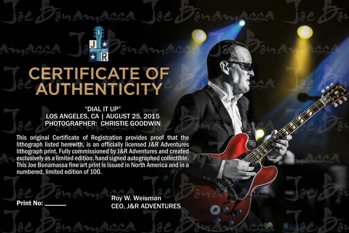 This is a limited run of ONLY 100 prints. Each lithograph is personally hand-signed by Joe Bonamassa and comes with a certificate of authenticity ensuring the quality and collectible nature of each piece. Each of the 100 owners of the prized " Dial It Up " lithograph will receive 2 tickets + meet & greet passes to the show of their choice.