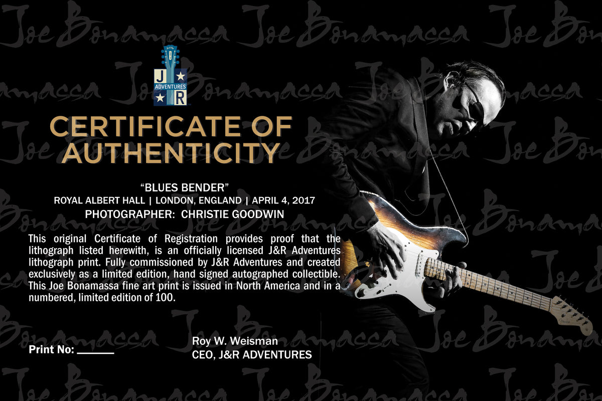 The "Blues Bender" is a limited run of ONLY 100 lithograph prints. Each lithograph is personally hand-signed by Joe Bonamassa and comes with a certificate of authenticity ensuring the quality and collectible nature of each piece.