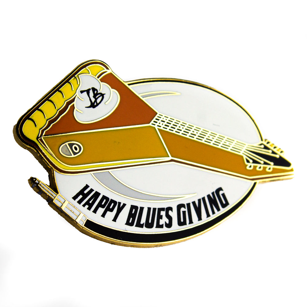 The holidays are just around the corner and it’s a time for friends and family to come together to give thanks and count their blessings. This is the inspiration for the newest JB pin “Happy Blues Giving Pin”. What a better way to remind yourself about what you’re thankful for than something that you can display or wear. The design is a Flying V guitar made to look like a piece of pumpkin pie with a dollop of whipped cream just to make it extra special!