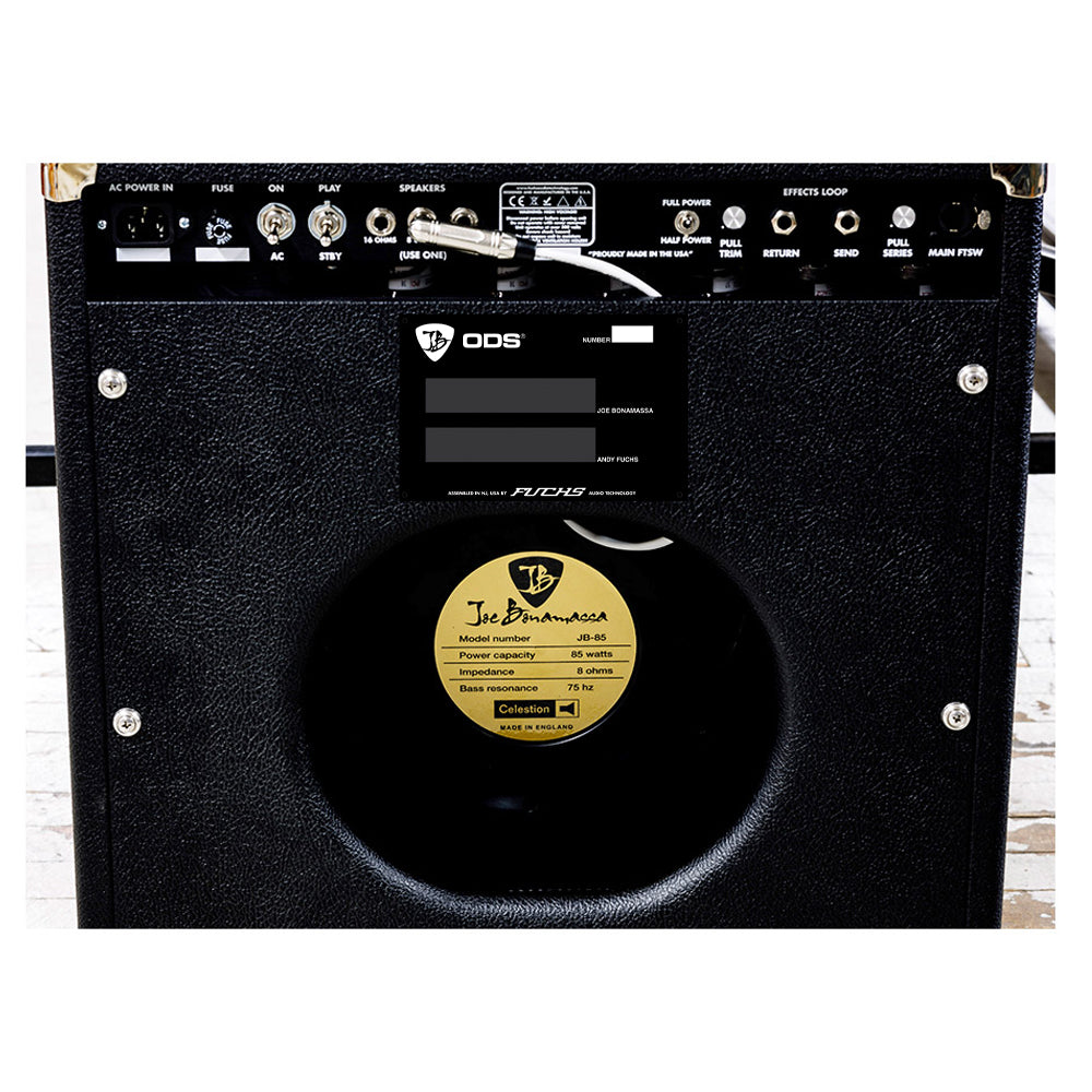 While it shares the chassis and basic execution of the ODS-Classic, the JB-ODS 1x12, 100-watt combo features Joe's signature Celestion model JB-85, 12-inch speaker. The amp has two gain boosts - one of which kicks the front end harder and retains the tone controls in circuit and a second boost that bypasses the tone controls. A three-position brite switch provides two distinct EQ curves with a central "off" position. A deep switch helps to warm up single coil pickups while a three position EQ switch includes two EQ settings with a bypass option. The amp features high, mid and low controls with a selectable mid-boost frequency. Also standard is a full-time effects loop which can be operated in series or parallel with either pedal or line level effects. Speaker outputs for 4, 8 or 16 ohms are on the rear panel. The aluminum chassis is cooled by a DC fan, which runs quietly and keeps the amp cool all night. Under the hood, the amp is a combination of PC board and point-to-point wiring. The power supply board features high speed rectifier diodes and a screen regulator for extended power tube life and greater dynamics. Each power tube has an independent bias control for optimum tube life and sound quality. All preamp tube filaments are run on regulated DC for lowest noise. All switching is by DC powered relay switching. The digital 16-Bit reverb is via a Spin Semiconductor chip (the finest modern digital reverb available) and has an adjustable dwell control. All tubes are Ruby Tubes selected JJ's. Each JB-ODS amp is tubed, biased, measured and play tested by Andy to match the shop prototype. The cabinet is constructed of white pine with a black tolex covering and is fitted with premium hardware, Joe's choice of grill cloth and a Fuchs logo. The amp comes with a 2-way footswitch, but since it is equipped with an ethernet connector, an Artist footswitch can be ordered through Fuchs separately if desired. The rear panel features a label signed by both Joe and Andy.